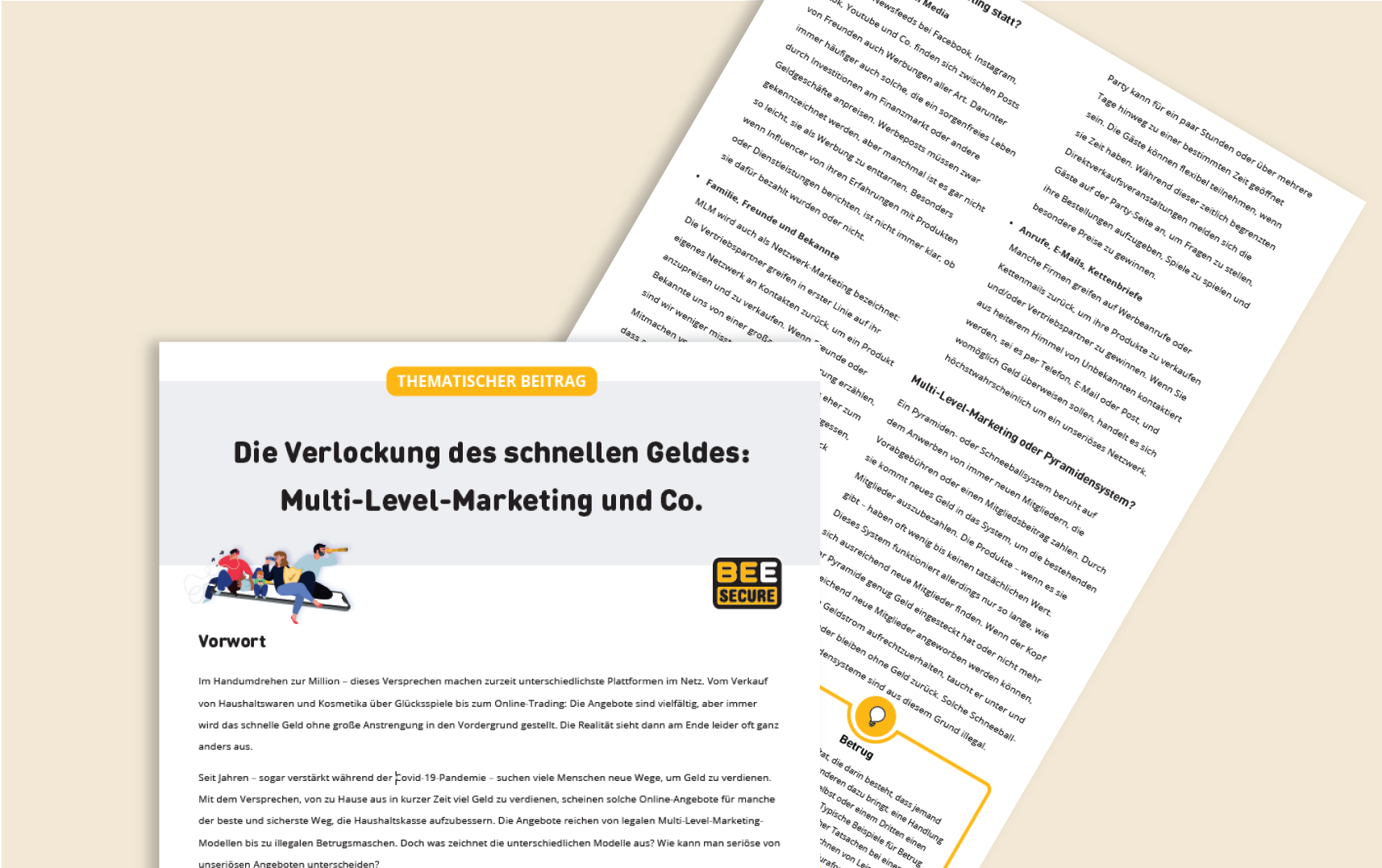 Im vergangenen Jahr machten Multi-Level-Marketing (MLM) Angebote viel von sich Reden, während aktuell das sogenannte „Money Muling“ als Bedrohung in Erscheinung tritt, und dabei vermehrt Jugendliche angeworben werden. BEE SECURE hat nun einen thematischen Beitrag mit dem Titel „Die Verlockung des schnellen Geldes: Multi-Level Marketing und Co.“ veröffentlicht, um aufzuzeigen, welche Tricks und Maschen im Umlauf sind und wie sich vor allem Jugendliche vor möglichem Schaden schützen können.